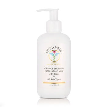 Orange Blosson Exfoliating Milk in white bottle with pump dispensing cap.